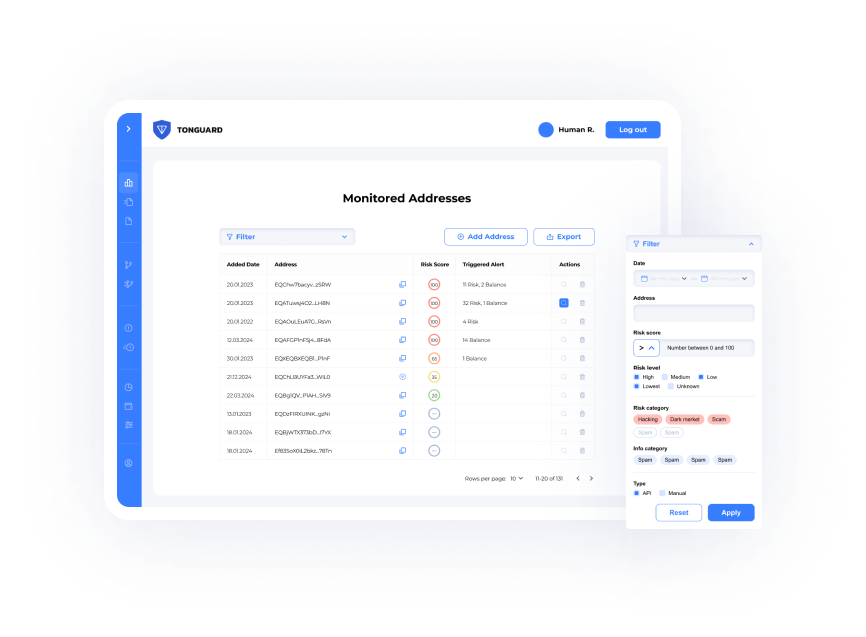 TON Guard is designed to integrate with existing compliance and anti-money laundering (AML) processes by API and in personal accounts. It can work in conjunction with your organization's compliance departments, providing valuable insights to support risk management and regulatory compliance efforts.